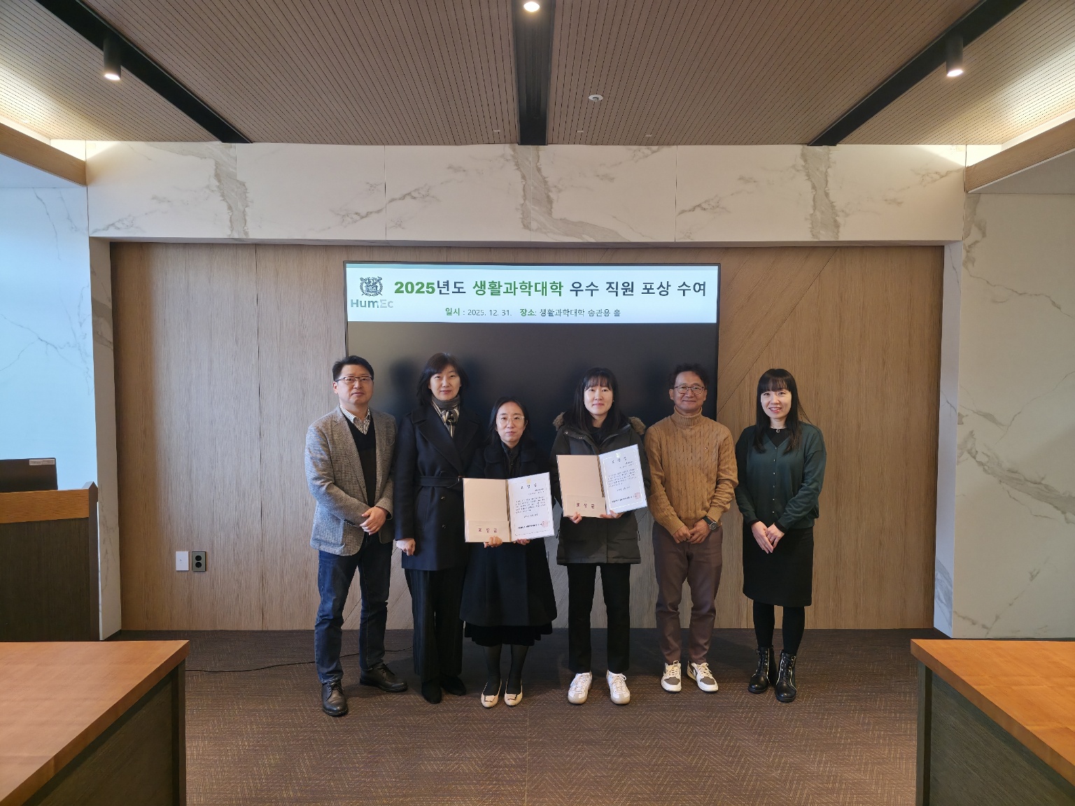 2025년 12월 31일(수) 생활과학대학 7층 송관용홀에서 진행된 2025년 생활과학대학 우수직원 포상 수여식에 이유리 학장, 전재훈 학생부학장, 주용식 행정실장, 정하갑 서무주임이 참석하여 자리를 빛냈다. 공정한 심사를 거쳐 2025년 생활과학대학 우수직원으로 선정한 교무 담당 이서주 주무관과 서무 담당 임신주 주무관에게 표창장 및 포상금이 수여되었다.